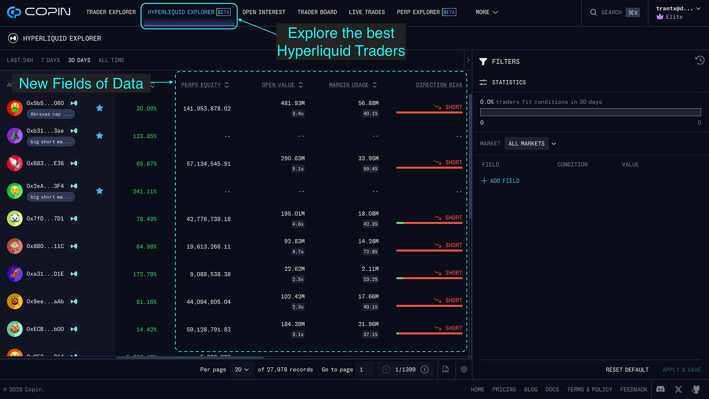 Hyperliquid Explorer Views: Traders can now search for whales and smart money directly among Hyperliquid’s leaderboard elite. Filter by performance, labels, and behaviors to uncover the very best in one dedicated view.
