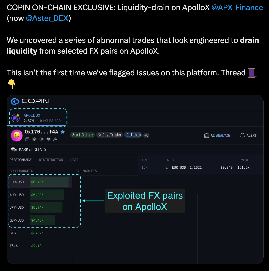 ApolloX / Aster DEX Exploit — “Ghost Price” Manipulation Flagging another issue on this platform, we exposed abnormal trades closing at “ghost prices” on FX pairs like AUD/USD, enabling impossible wins at 200x leverage and draining $23K. Despite our prior reports (including a $300K unliquidated loss bug in April) and advance notice, the Aster team took no visible action, allowing the scheme to persist. This history of concerns amplifies risks in their ecosystem. 🔗 Read more