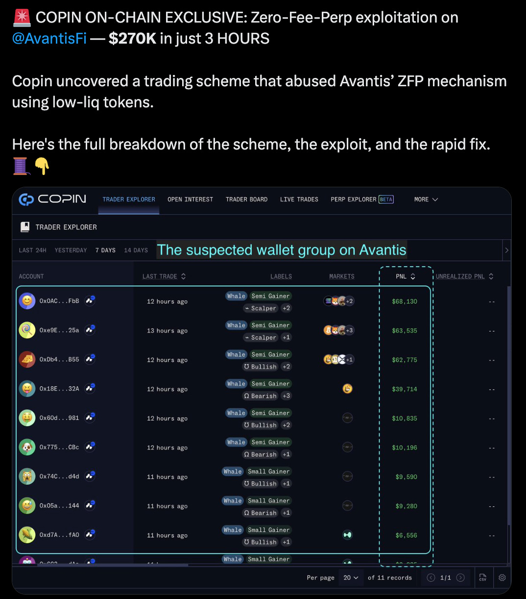 Avantis Exploit — $270K Drained in 3 Hours We detected an abuse of Avantis’ zero-fee mechanism on low-liquidity tokens like $FARTCOIN, $BONK, $SHIB, and $WIF. With the clever tactic, the attacker funneled out $270K in record time. After Copin reported the incident, the Avantis team swiftly deployed a fix. 🔗 Read more