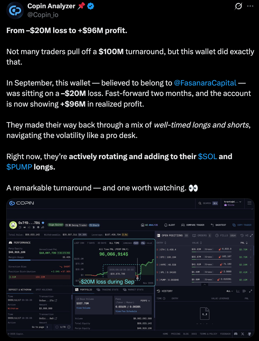 The $100M Turnaround (-$20M to +$114M): A Hyperliquid wallet (believed to be linked to Fasanara Capital) was down $20M in September. Instead of folding, they executed strategic shorts that flipped their PnL to +$96M in realized profit, sitting at +$114M overall by month’s end. A masterclass in conviction. 👉 Read the thread