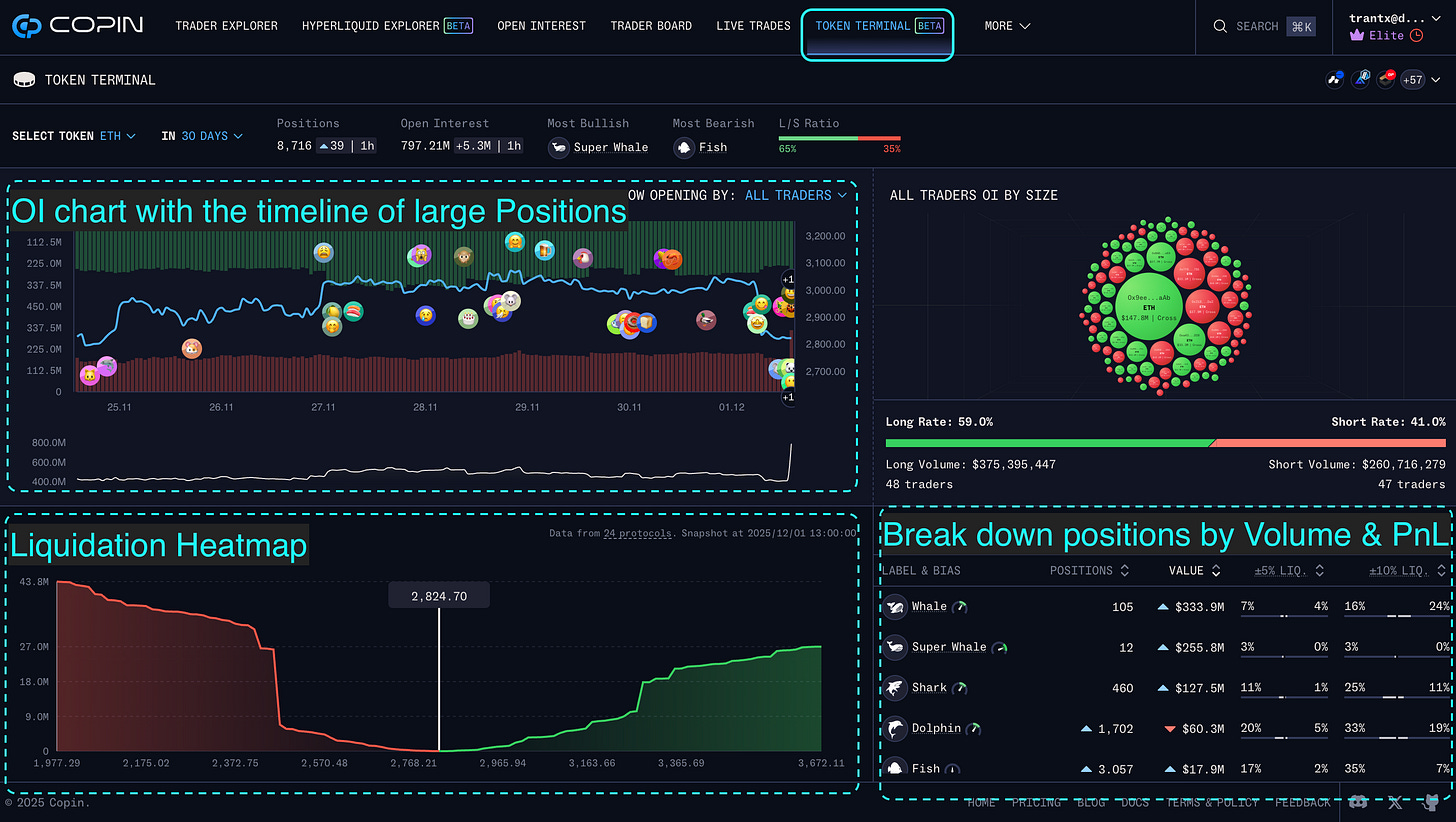 Launched Token Terminal for deep token analysis, including Open Interest, liquidation heatmaps, and position breakdowns.