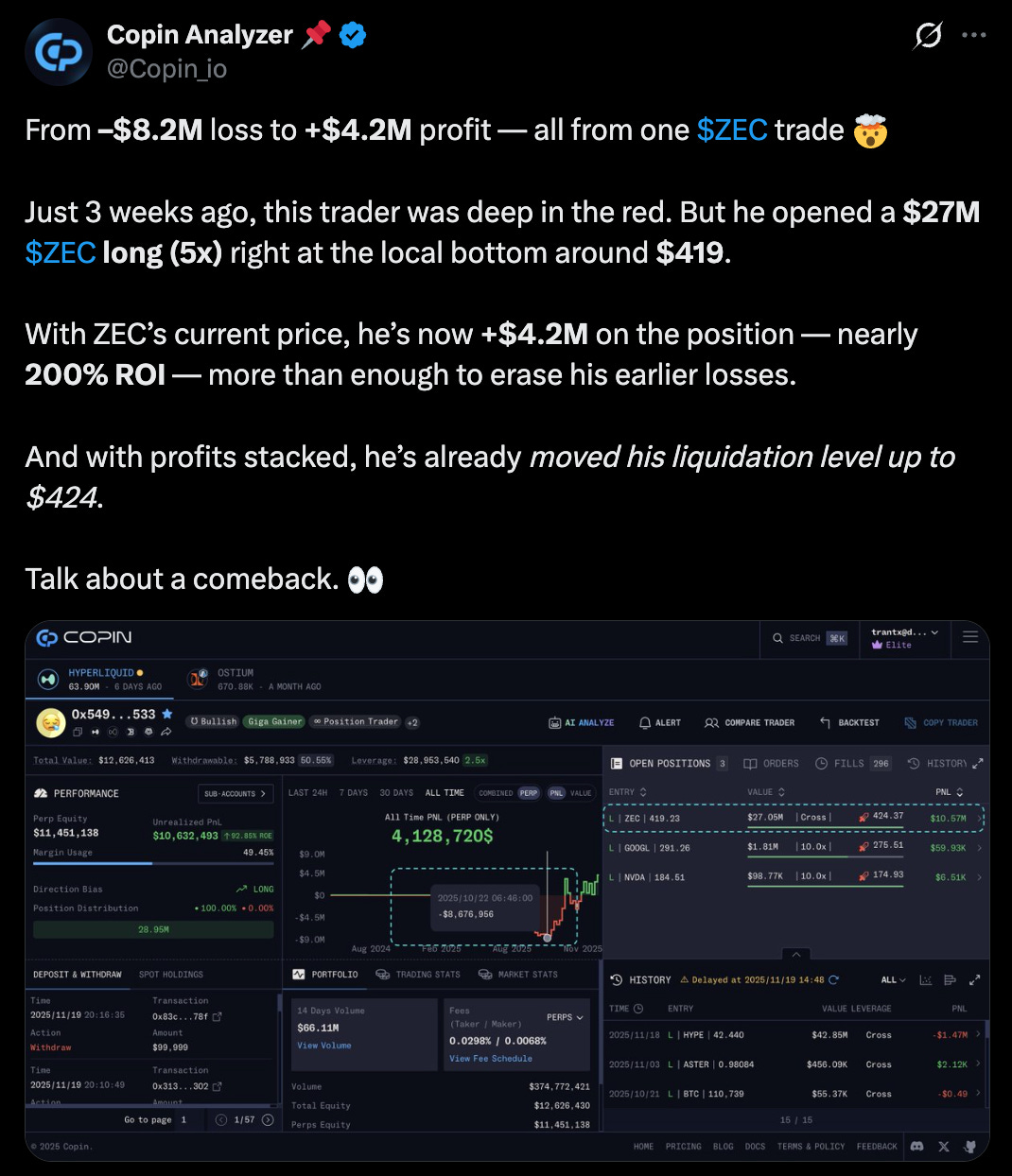 The $ZEC Comeback King: Three weeks ago, this trader was deep in the red with -$8.2M losses. They nailed a bottom-fishing $27M long on $ZEC (5x leverage) at ~$419. The result? A $4.2M profit and a nearly 200% ROI that wiped out all prior losses. 👉 See the details