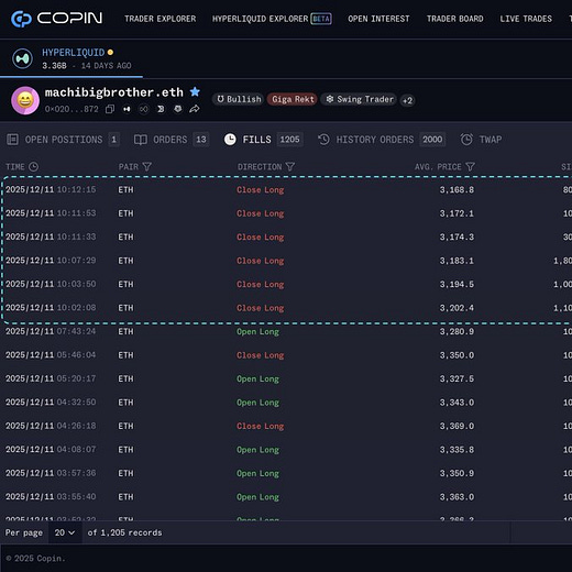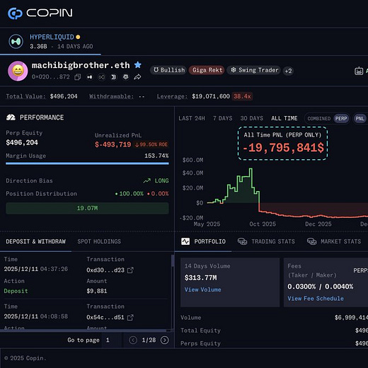 The Tragedy of the Perma-Bull One of the most discussed stories this month was the legendary Machibigbrother. Known for his aggressive long-only approach, he experienced a brutal drawdown. From a high of $45M in profits, a series of liquidations dragged his PnL down to a $21M loss. While the numbers are painful, his resilience in the face of the market is a lesson for us a